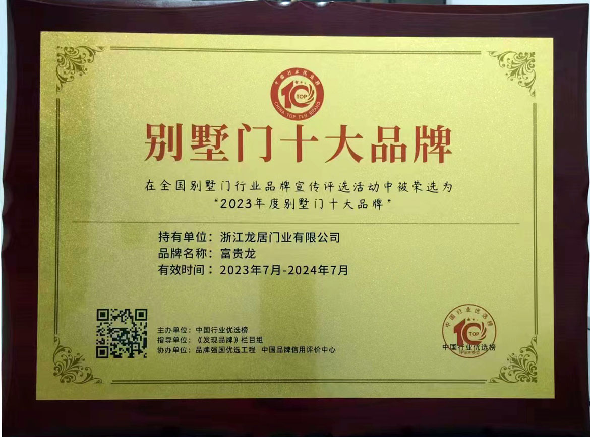浙江龍居門業有(yǒu)限公(gōng)司榮譽宣布,“富貴龍”品牌榮獲2023年别墅門十大品牌殊榮。這一榮譽标志(zhì)着公(gōng)司在高端門窗制造業領域的領先地位,以及對品質(zhì)、創新(xīn)和客戶滿意度的持續追求。